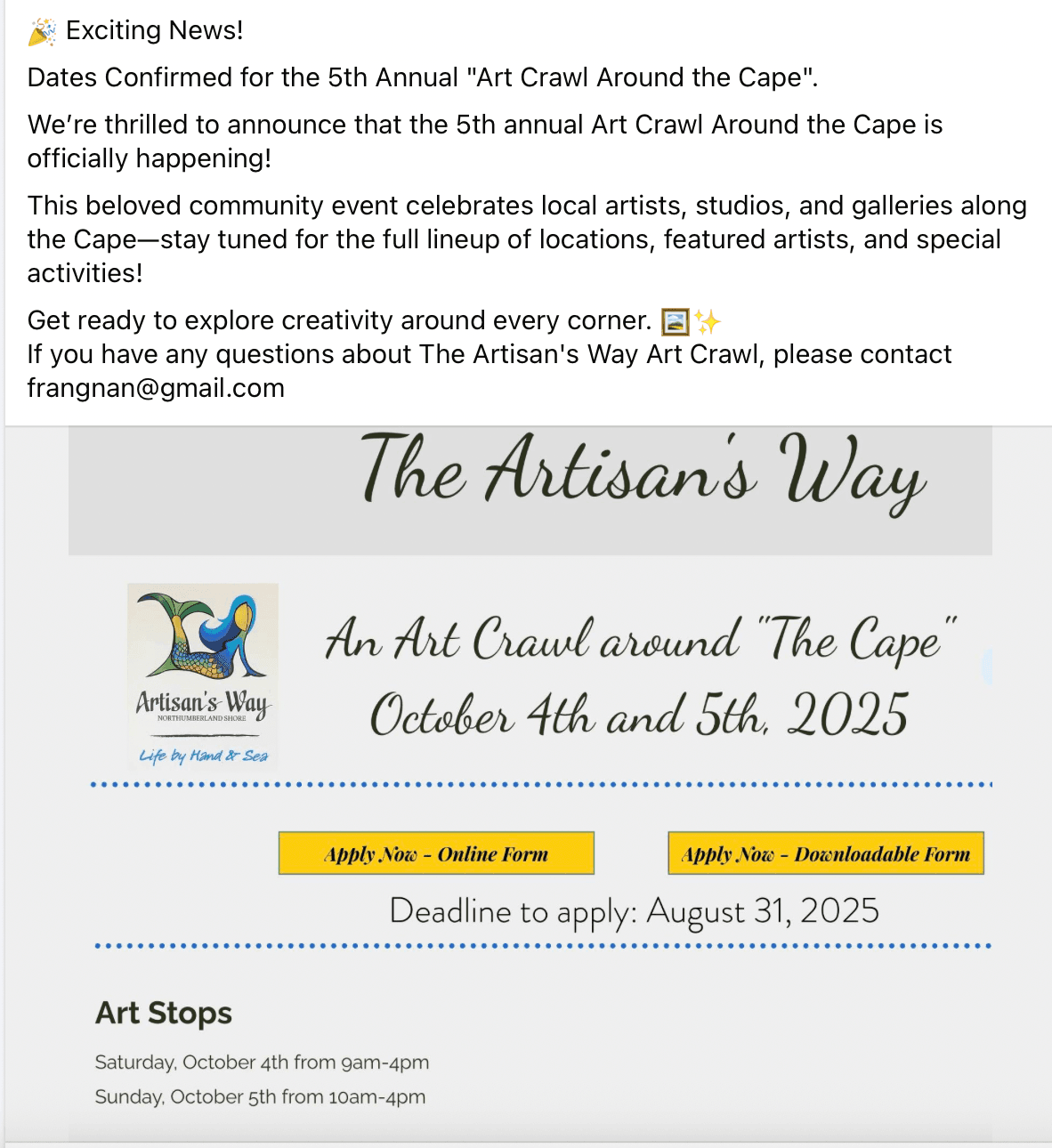 The Antigonish Art Fair is a lively community event held in downtown Antigonish at Chisholm Park. It features local musicians performing in the Gazebo, talented artists and artisans showcasing their work, a dedicated children’s area, and delicious offerings from local food vendors